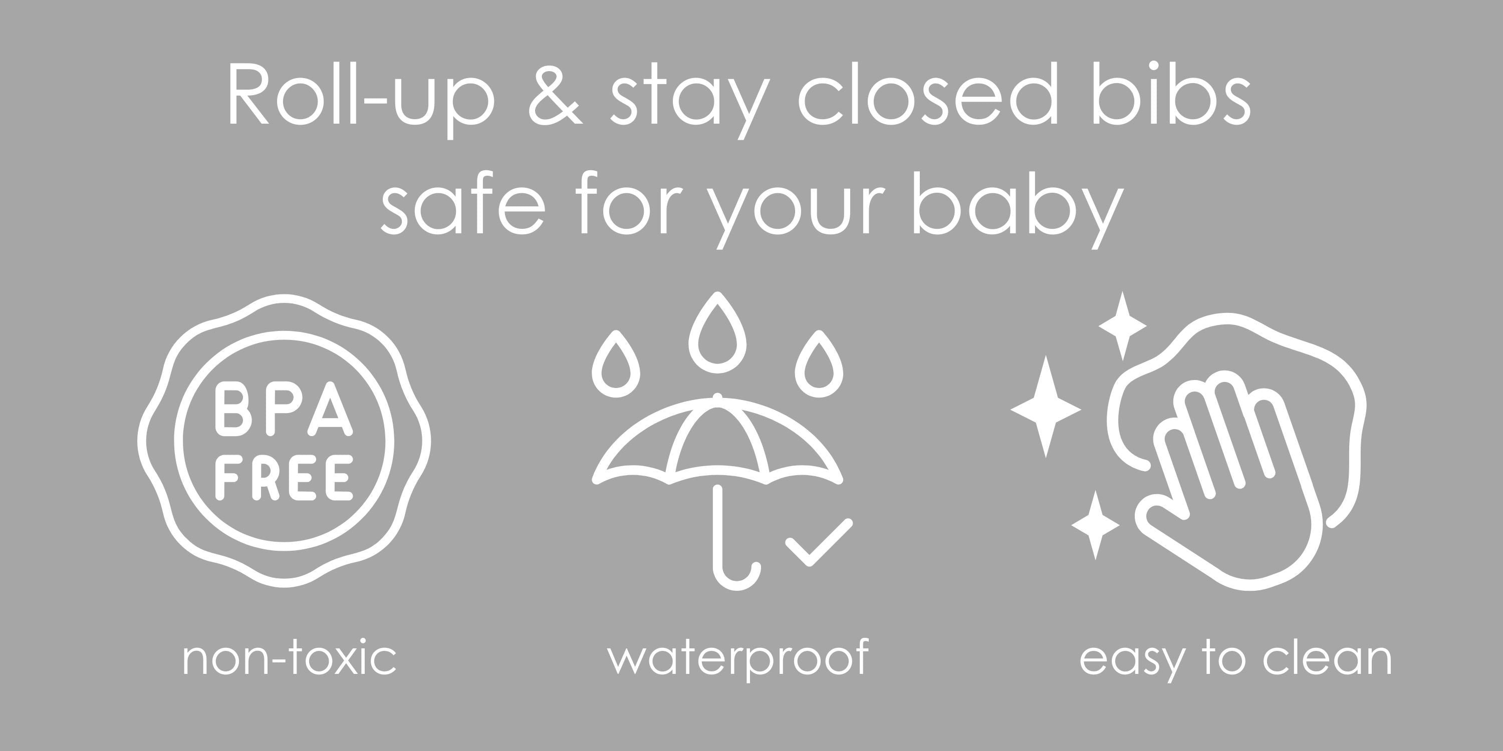 Our waterproof baby silicone bibs are designed with a wide, stay-open front pocket and can easily be rolled up to contain most of the mess until they can be washed. The stay closed button allows for easy storage in diaper bags, and adjustable straps make them ideal for 4m+ babies beginning to self feed.